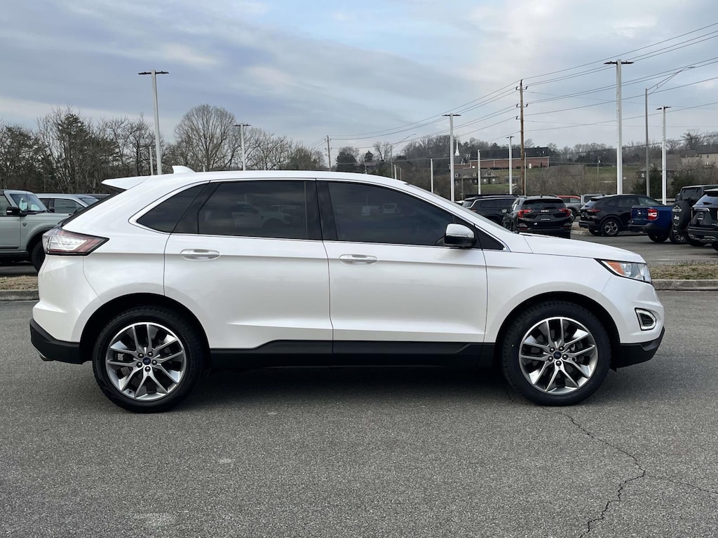 White Platinum 2018 Ford Edge Titanium FWD 6-Speed Automatic 3.5L V6 Ti-VCT ***ONE OWNER***, ***LOCAL TRADE***, 12 Speakers, 3.36 Axle Ratio, 4-Wheel Disc Brakes, ABS brakes, Air Conditioning, Alloy wheels, AM/FM radio: SiriusXM, AM/FM Stereo w/Single CD Player, Apple CarPlay/Android Auto, Auto-dimming Rear-View mirror, Automatic temperature control, Brake assist, Bumpers: body-color, CD player, Compass, Delay-off headlights, Driver door bin, Driver vanity mirror, Dual front impact airbags, Dual front side impact airbags, Electronic Stability Control, Emergency communication system: SYNC 3 911 Assist, Equipment Group 300A, Exterior Parking Camera Rear, Four wheel independent suspension, Front anti-roll bar, Front Bucket Seats, Front Center Armrest w/Storage, Front dual zone A/C, Front reading lights, Fully automatic headlights, Garage door transmitter, Heated door mirrors, Heated front seats, Illuminated entry, Knee airbag, Leather Shift Knob, Leather-Trimmed Heated Sport Bucket Seats, Low tire pressure warning, Memory seat, Occupant sensing airbag, Outside temperature display, Overhead airbag, Overhead console, Panic alarm, Passenger door bin, Passenger vanity mirror, Power door mirrors, Power driver seat, Power Liftgate, Power passenger seat, Power steering, Power windows, Premium audio system: Sony, Rear anti-roll bar, Rear Parking Sensors, Rear reading lights, Rear seat center armrest, Rear window defroster, Rear window wiper, Remote keyless entry, Security system, SiriusXM Radio, Speed control, Speed-Sensitive Wipers, Split folding rear seat, Spoiler, Steering wheel mounted audio controls, SYNC 3 Communications & Entertainment System, Tachometer, Telescoping steering wheel, Tilt steering wheel, Traction control, Trip computer, Turn signal indicator mirrors, Variably intermittent wipers, Wheels: 19" Nickel-Painted Aluminum, Wheels: 20" Bright Machined Aluminum.