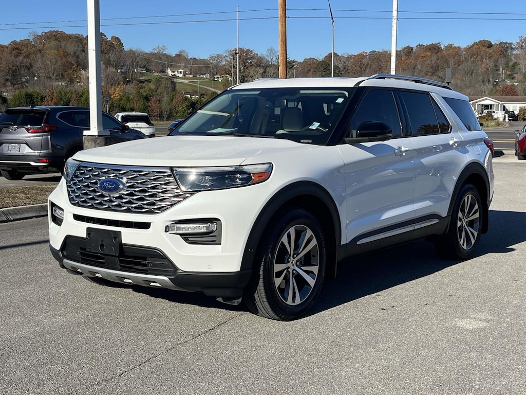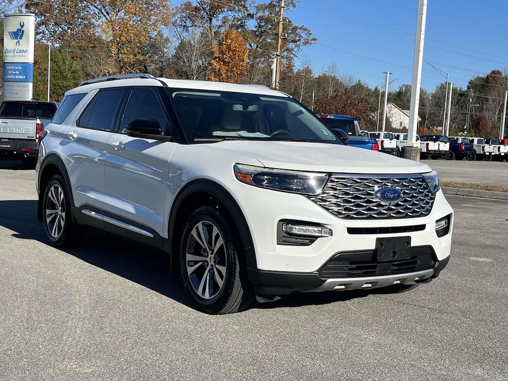 White 2020 Ford Explorer Platinum 4WD 10-Speed Automatic 3.0L EcoBoost V6 4WD, 12 Speakers, 3.31 Non-Limited-Slip Axle Ratio, 3rd row seats: bench, 4-Wheel Disc Brakes, ABS brakes, Air Conditioning, Alloy wheels, AM/FM radio: SiriusXM, Auto High-beam Headlights, Auto-dimming door mirrors, Auto-dimming Rear-View mirror, Automatic temperature control, Brake assist, Bumpers: body-color, Compass, Delay-off headlights, Driver door bin, Driver vanity mirror, Dual front impact airbags, Dual front side impact airbags, Electronic Stability Control, Emergency communication system: SYNC 3 911 Assist, Exterior Parking Camera Rear, FordPass Connect, Four wheel independent suspension, Front anti-roll bar, Front Bucket Seats, Front Center Armrest, Front dual zone A/C, Front fog lights, Front reading lights, Fully automatic headlights, Garage door transmitter: HomeLink, Genuine wood dashboard insert, Heated door mirrors, Heated front seats, Heated rear seats, Heated steering wheel, Illuminated entry, Knee airbag, Leather steering wheel, Low tire pressure warning, Memory seat, Navigation System, Occupant sensing airbag, Outside temperature display, Overhead airbag, Overhead console, Panic alarm, Passenger door bin, Passenger vanity mirror, Power door mirrors, Power driver seat, Power Liftgate, Power moonroof, Power passenger seat, Power steering, Power windows, Radio data system, Radio: B&O Sound System by Bang & Olufsen, Rain sensing wipers, Rear air conditioning, Rear anti-roll bar, Rear reading lights, Rear window defroster, Rear window wiper, Remote keyless entry, Roof rack: rails only, Security system, Speed control, Speed-sensing steering, Speed-Sensitive Wipers, Split folding rear seat, Spoiler, Steering wheel memory, Steering wheel mounted audio controls, SYNC 3 Communications & Entertainment System, SYNC 3/Apple CarPlay/Android Auto, Tachometer, Telescoping steering wheel, Tilt steering wheel, Traction control, Trip computer, Turn signal indicator mirrors, Variably intermittent wipers, Ventilated front seats, Voice-Activated Touchscreen Navigation System, Wheels: 20" Bright Machined-Face Aluminum, 4WD.